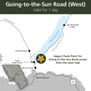 - WEST ENTRANCE (Going-to-the-Sun Road at Apgar Checkpoint): May 24-September 8