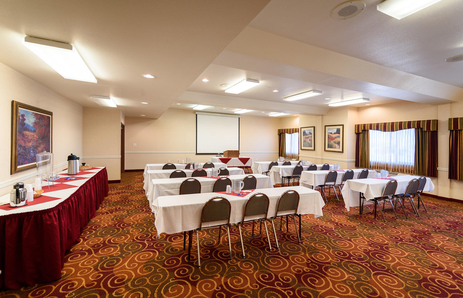 This is a meeting space inside a hotel (across the way from the airport), with a free medium parking lot. We are a no frills community, so there isn’t valet. However, if you need it, we can see if the local baseball club is interested in offering this service for a donation to their club. The venue was built in 2001, and is updated as they see necessary. The audio visual consists of a stand up screen and the internet is fiber and is free with the use of the meeting room. It’s a great space with 4 walls to meet in, but this city . . . it’s so much more than just four walls.
