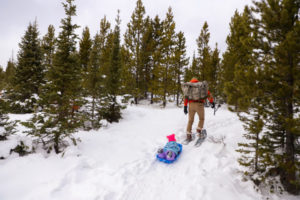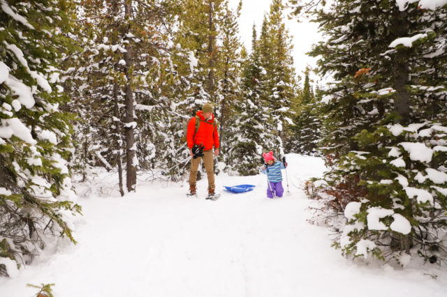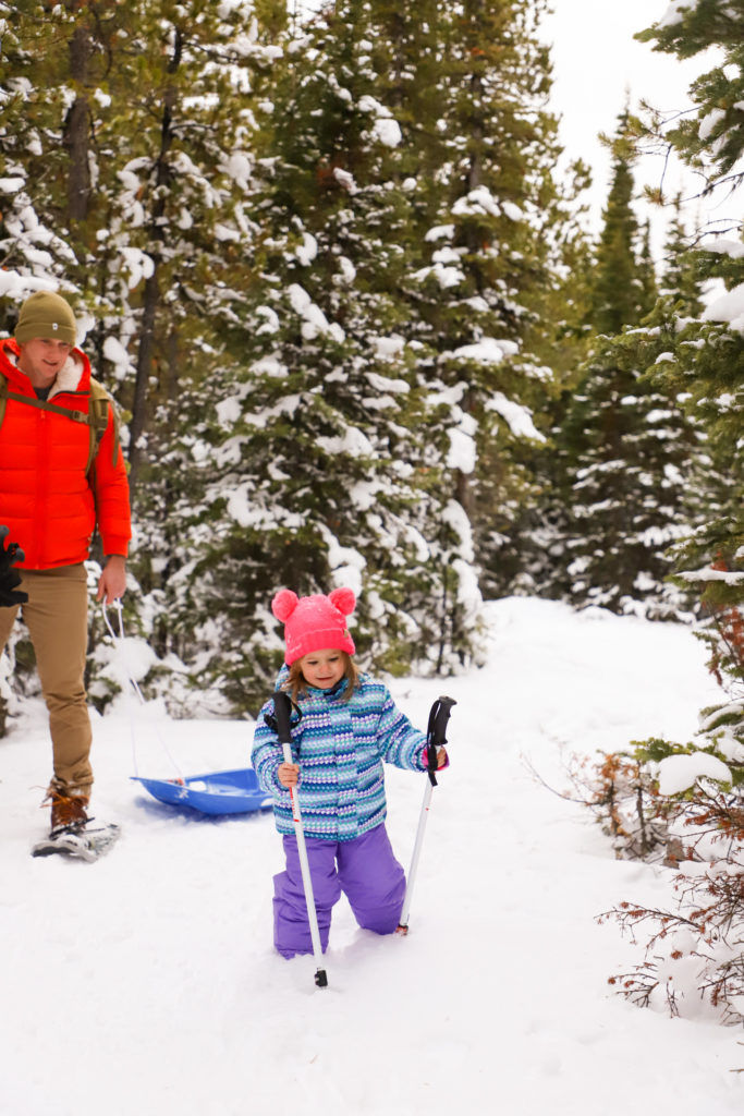 The process really was quite easy. I reserved the snowshoes, my husband picked them up (hence the easy part), and we packed some snacks for our snowshoeing adventure. Our daughter, who is just over 2.5 years old, was excited about the adventure too. Although she didn’t have snowshoes, we brought a sled to pull her along the trails. However, once she saw the shoes and the poles used with them, she wanted nothing to do with her sled and was adamant about using the shoes and poles herself. Thankfully, she let me use my snowshoes and was fine just using my poles.