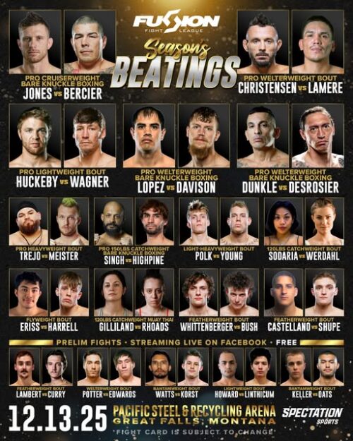 Montana ExpoPark 400 3rd Street NW, Great Falls, United StatesGet ready for a festive fight night presented by Fusion Fight League. One of their most stacked fight cards of the year it is sure to be an absolute bash! More information and tickets here. Saturday, December 14, 2025