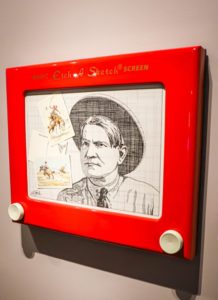 Close to Michael Blessing’s art was another mixed media art piece that was, well…just plain cool. Ben Steele’s Drop Me a Line looks like an extremely large etch a sketch of Charlie Russell. In reality, it is an oil painting, and an automotive manufacture made the etch a sketch frame precisely for this piece.